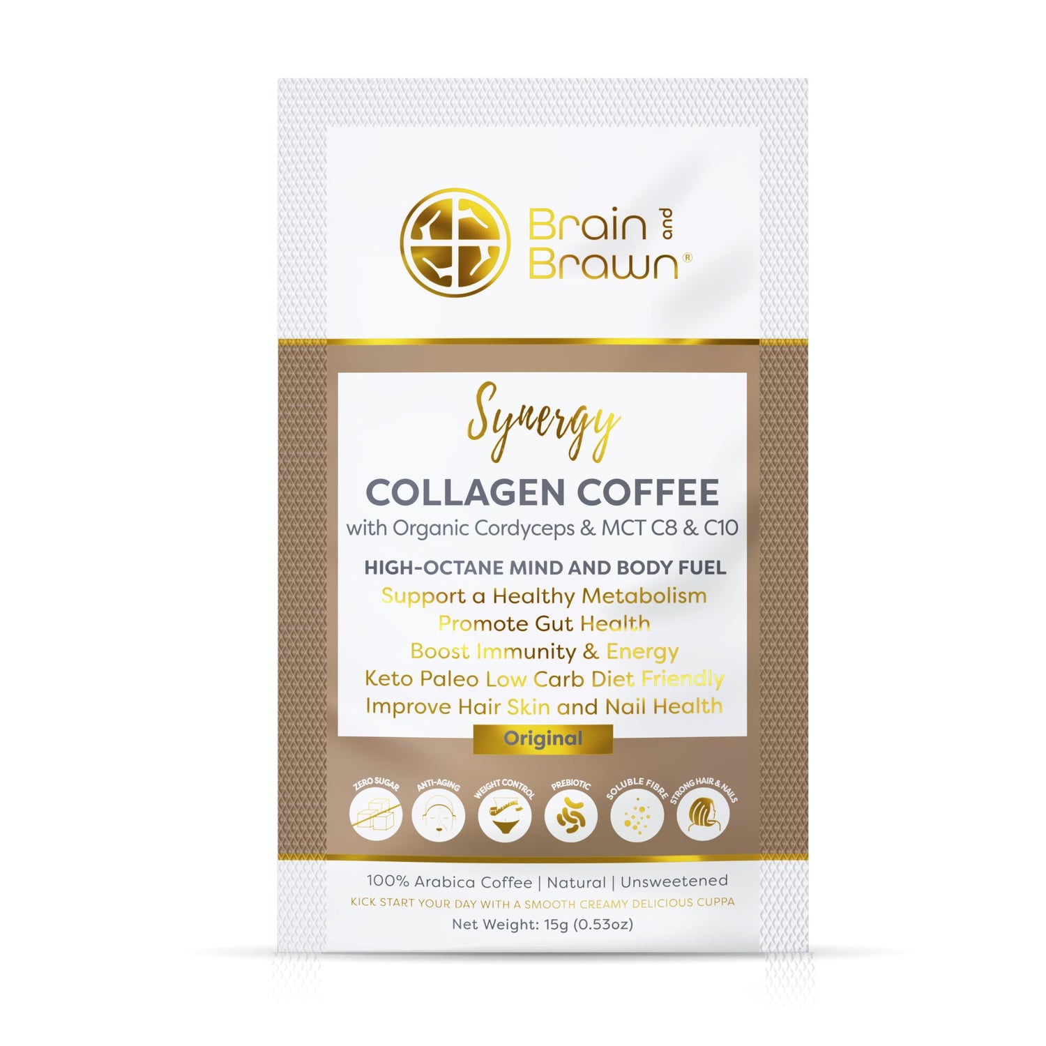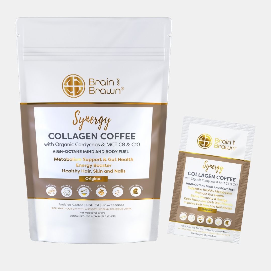 Kick start your day at your best with our Synergy blend! Arabica coffee infused with Collagen, Organic Cordyceps & MCT Oil. Improve Hair Skin and Nail Health, boost immunity, gut health, focus & energy. Unsweetened. Also available in 20 sachet carton.